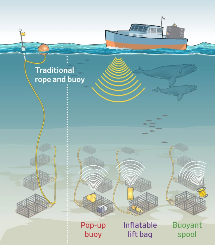 - Traps used in Maine's lobster fishery sit on the seafloor are retrieved with buoy/end lines, ropes that hang vertically in the water column. Whales can become accidentally entangled in these ropes in areas where whales and fishing gear overlap.